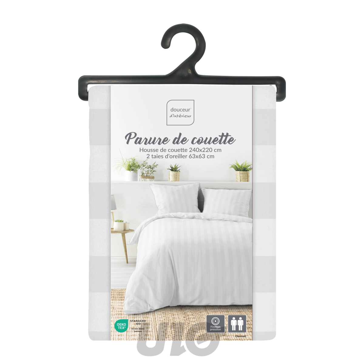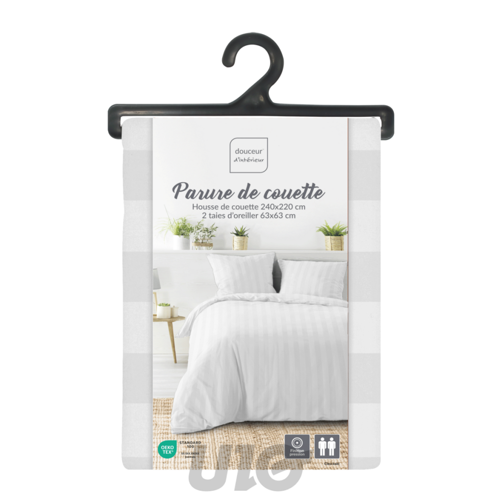 Cette parure de couette imprimée Cléo 3 pièces est composée de : 1 housse de couette 220x240 cm finition pression 2 taies d'oreiller 63x63 cm